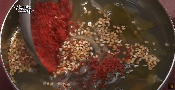 다 끓인 뒤에 참기름? 깨, 고춧가루를 넣어서 먹는다.
