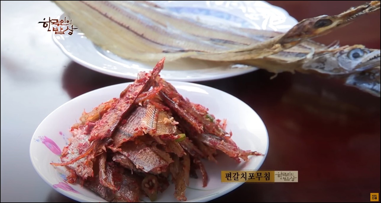 한국인의 밥상 2020.10.08. 480회 "진주만의 보물 밥상을 찾아서" 적량마을 사람들과 갈치 부부, 남해 미조항 갈치 풋갈치(풀치) 금지체장이 18cm인데 삶아서 말려놓으니 이렇게 작아보입니다. 원래는