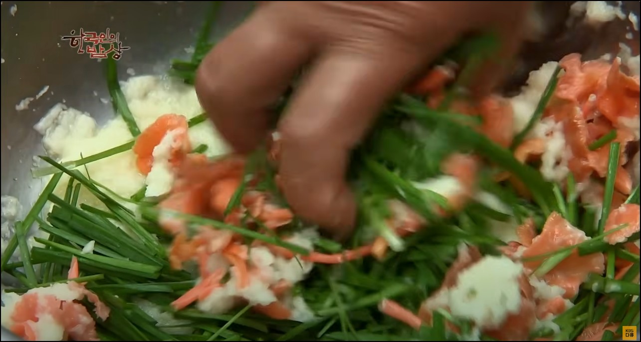 부추랑 양파도 들어가고 손으로 주물주물 잘 섞아준다.