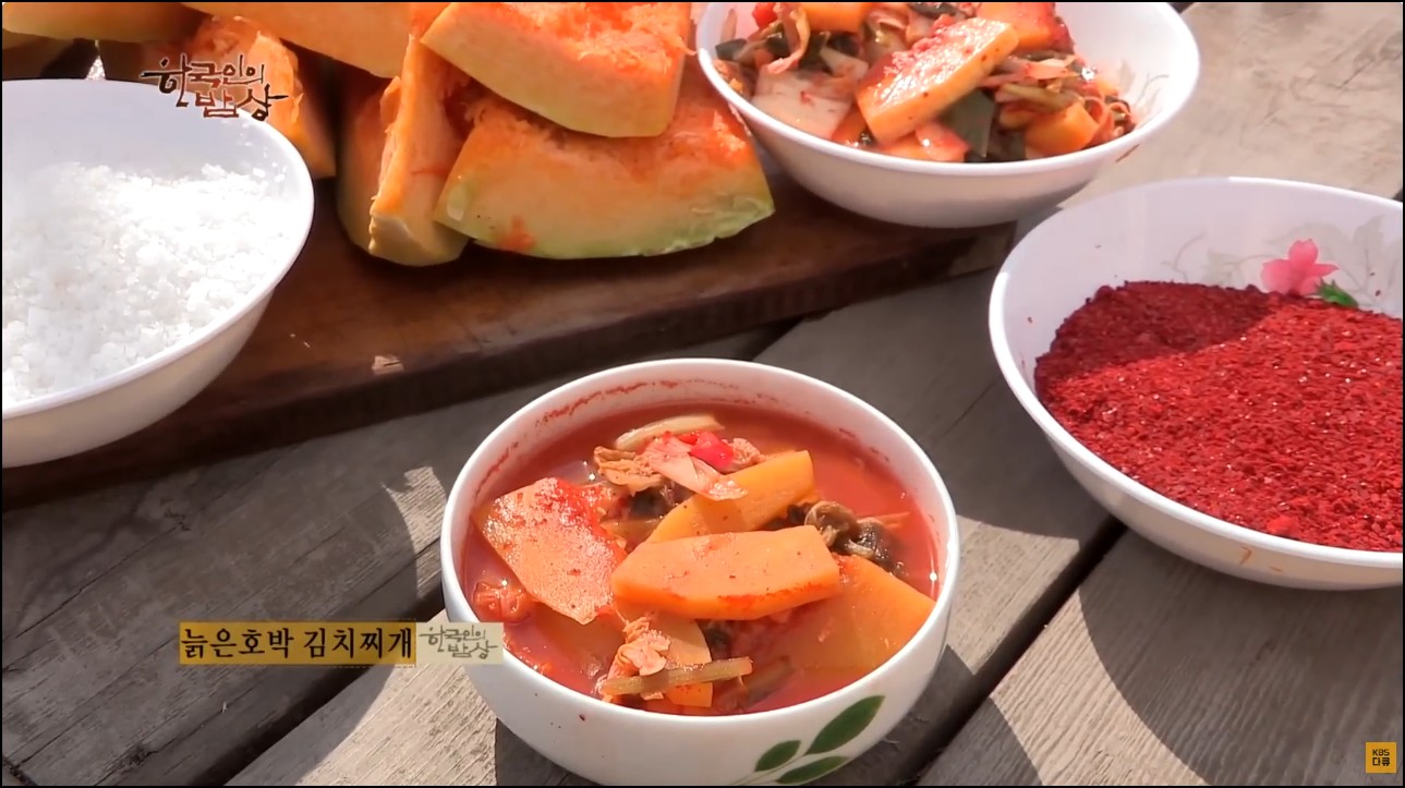 살짝 검색해보니 김장하다 남은 배추같은 것들에 늙은호박도 썰어 넣고 해서 만들어두고 찌개를 끓여먹는다고 하는글도 봤다.