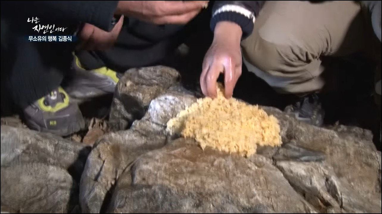 밖으로 나온 자연인은 돌에 이 라면밥을 펼침.....