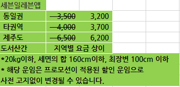 변경된 부분 빨간색으로 표시했고 토스예약은 예전엔 5kg이하 같은 가격이었는데 가격이 무게별로 나눠짐.